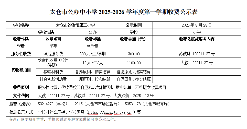 太仓市沙溪镇第三小学2024-2025学年第二学期收费公示