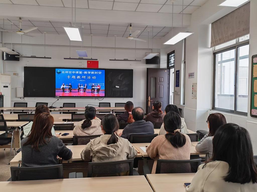 全体数学老师围坐在一起,观看教学新时空小学数学专题教研活动,研讨让学生感悟