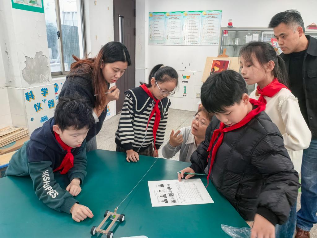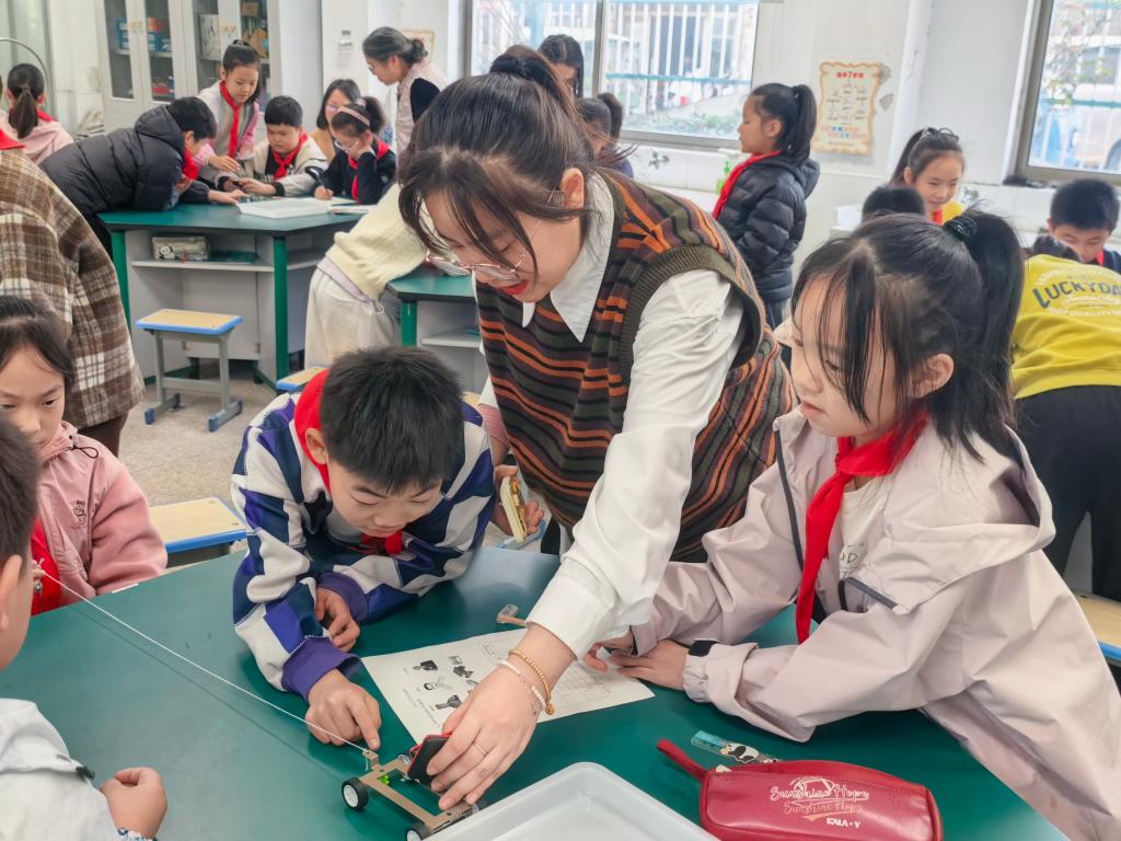 本次课题课是钱静佳老师执教的《让小车运动起来》,钱老师以“古今名人看苏超遇交通难题”为情境主线,串联起整节课。将瓦特、秦始皇、鲁迅等不同时代人物融入,既贴近生活(借足球赛事热度),又巧妙关联科学史,激发学生好奇心与探究欲,让科学知识学习有了趣味载体,符合小学生认知特点。从“聚焦交通匹配与动力”到“探索小车动起来及快慢影响”,再到“研讨总结与拓展延伸”,环节层层递进。先通过人物情境引出交通工具及动力认知,再聚焦“让小车动起来”,从人力到重力驱动,逐步深入探究力与运动关系。接着研究拉力大小对运动快慢影响,最后总结动力、阻力概念并拓展动力发展,符合科学探究“发现问题——实验探究——总结规律——迁移应用”的思维路径 。